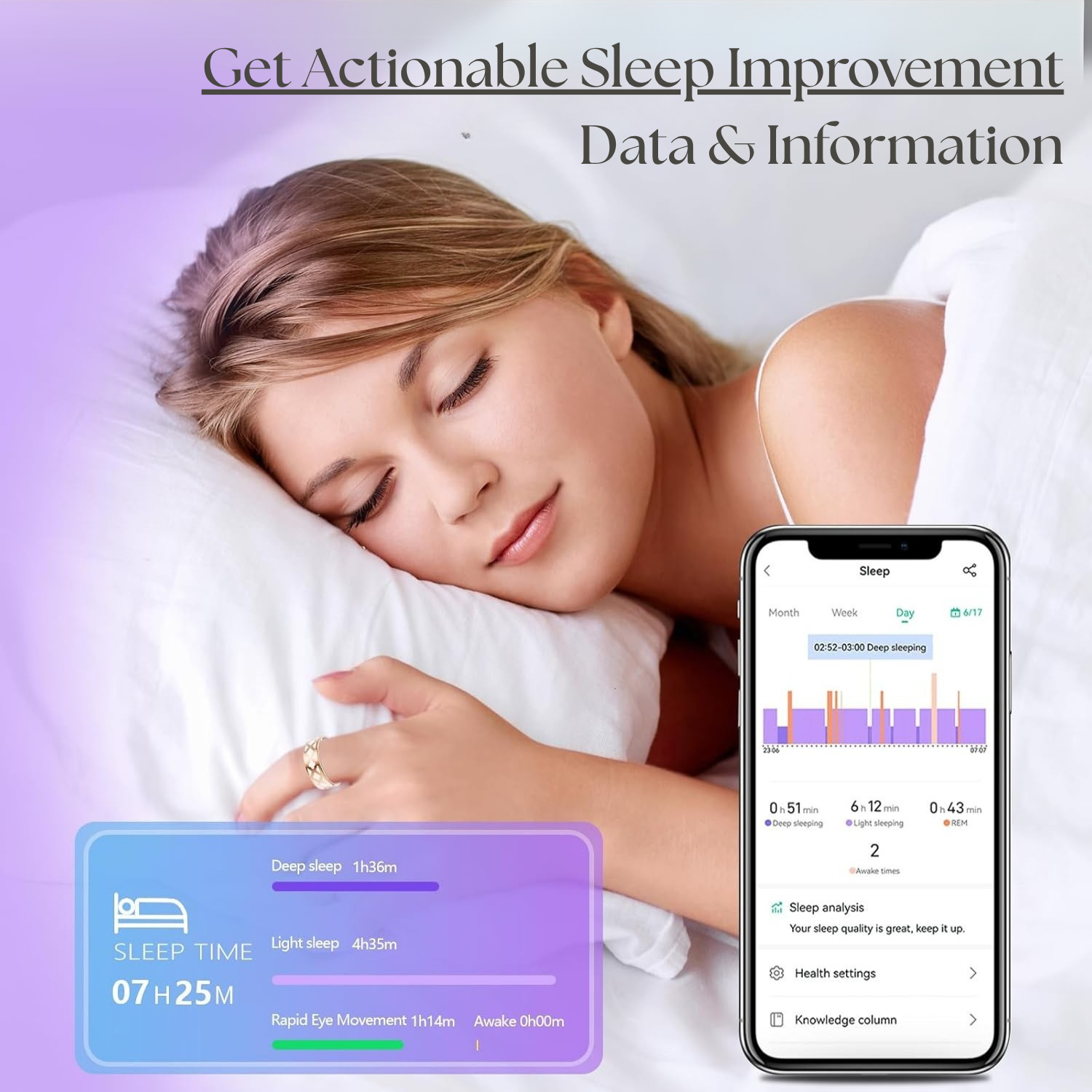 Built to look as good as it performs, this sleek, lightweight ring tracks your light, deep, and REM sleep stages to help you improve your rest over time. It's crafted from premium materials with a subtle, elegant design—so it blends seamlessly into your daily life while working silently through the night. Smart, stylish, and powerful.