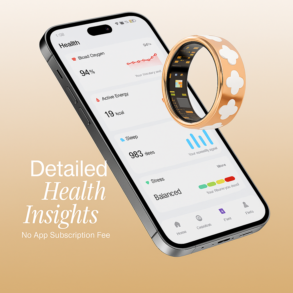 Track what really matters with 24/7 health monitoring right from your finger. This smart ring keeps an eye on your heart rate, heart rate variability (HRV), blood oxygen, and stress levels in real time—giving you the insights you need to stay informed, proactive, and in control. Whether you're managing health concerns or just want peace of mind, it's like having a personal health checkup that never stops.